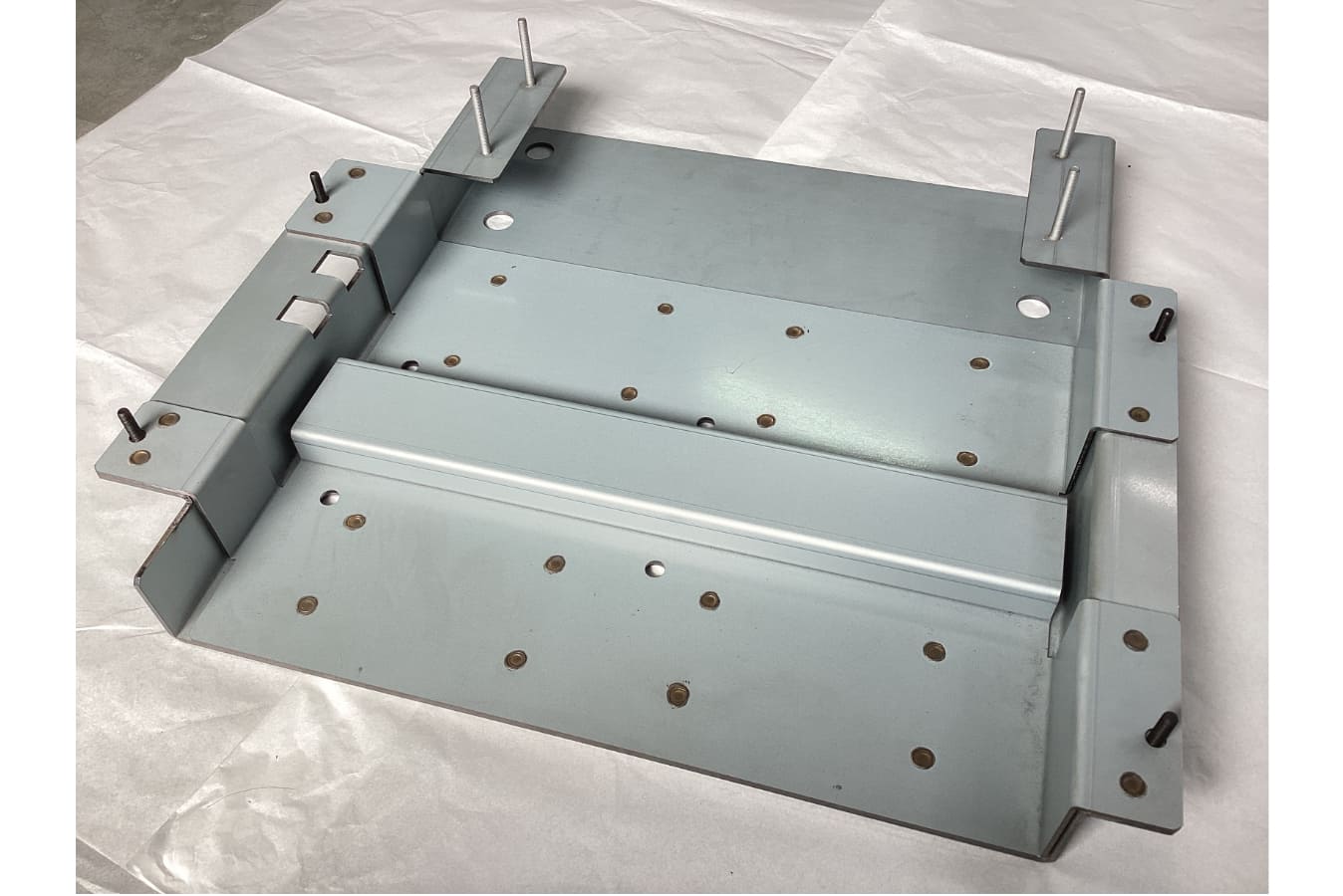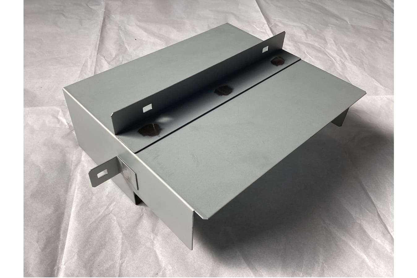 亜鉛メッキ板を素材とし、タレパン、ベンダー、スポット溶接といった加工技術を用いて製造された医療機器用カバーです。