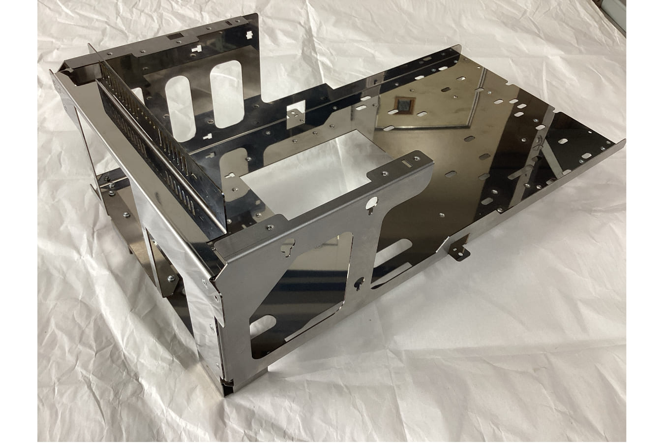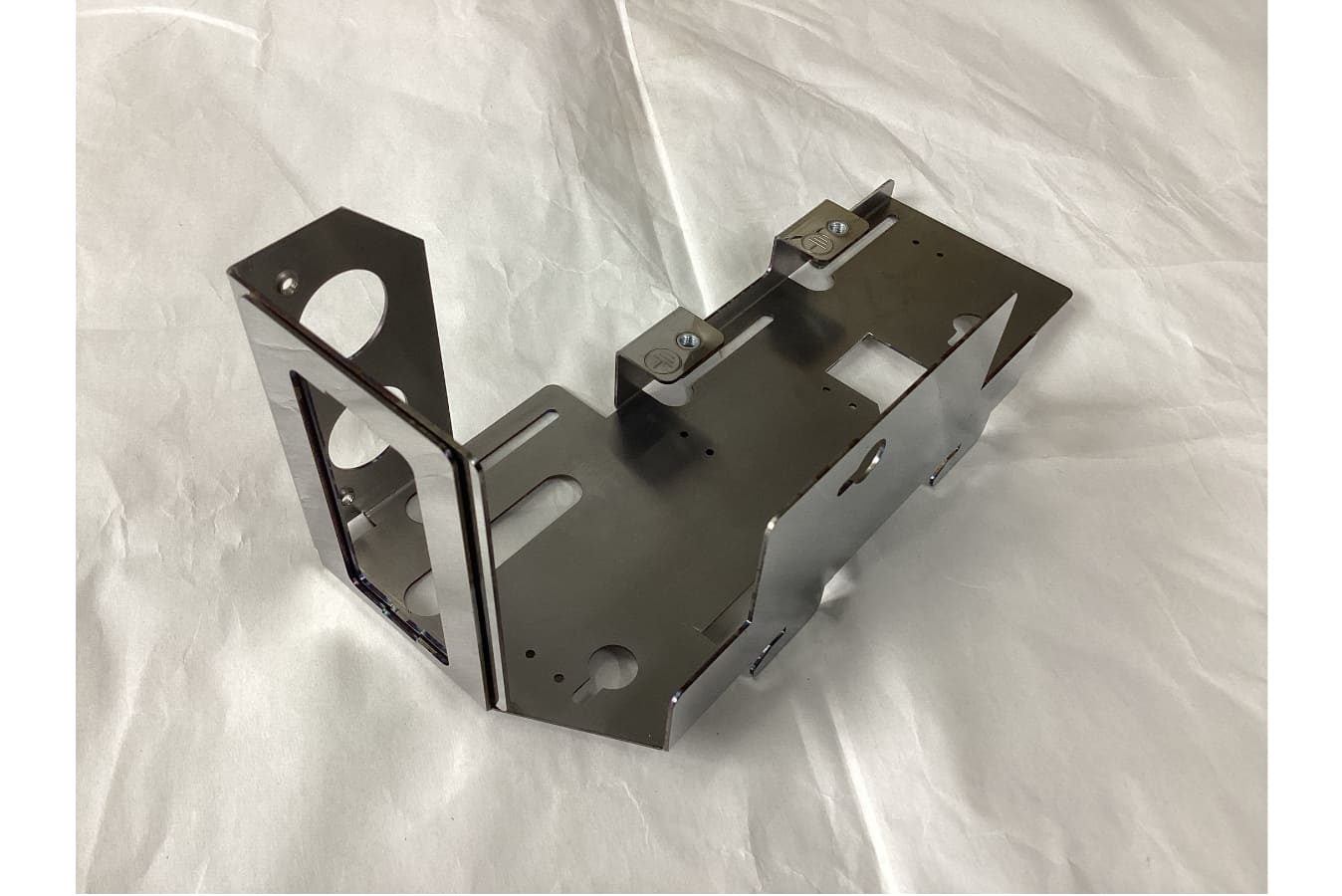 鉄素材の3.2mm厚板をレーザー加工、ベンダー加工、溶接、鍍金処理を組み合わせることで、高い...